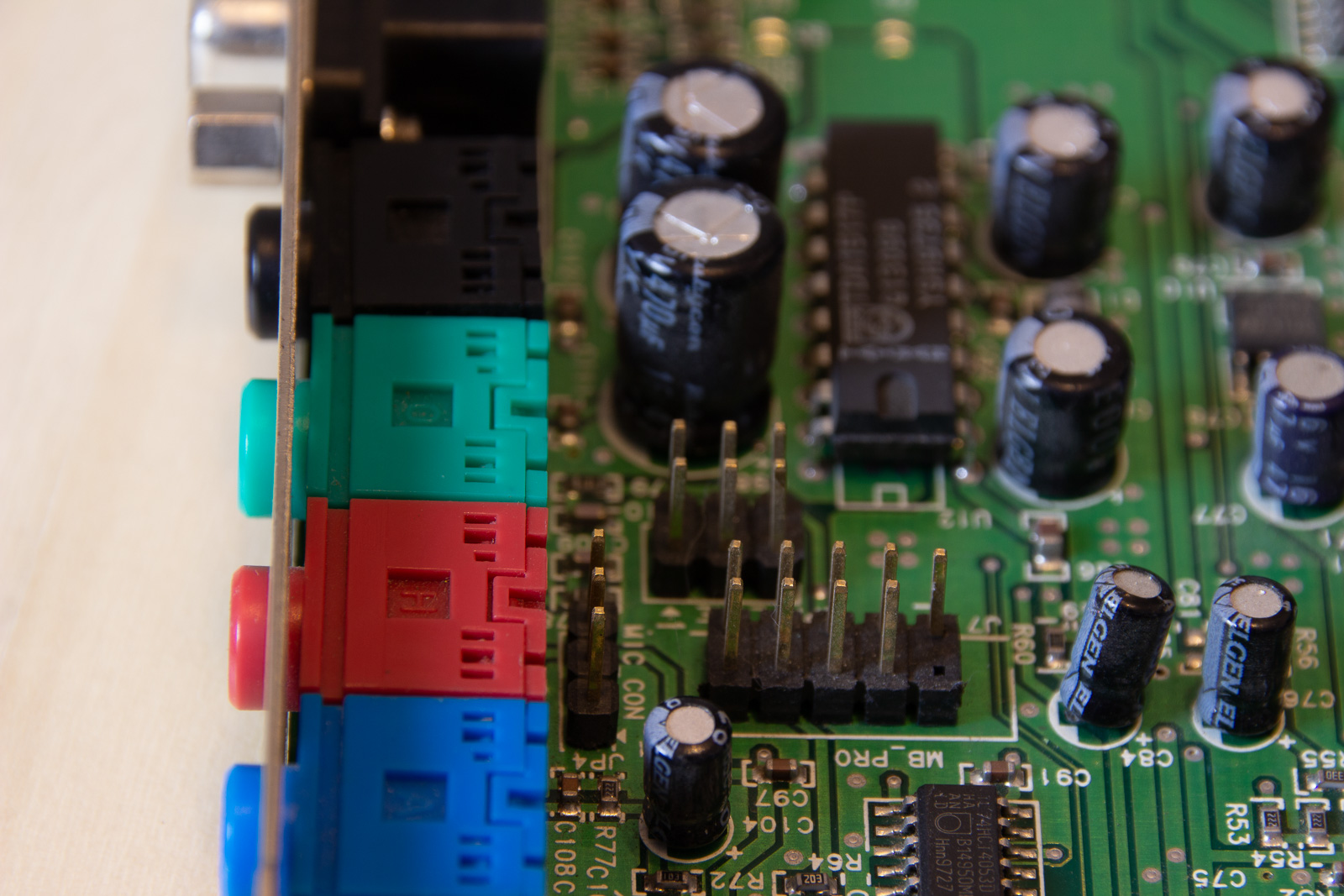 Karta dźwiękowa wyposażona jest w 5 złączy dostępnych na śledziu oraz kilka złączy jako piny na płytce. Zaczynając od śledzia mamy tu (od prawej):