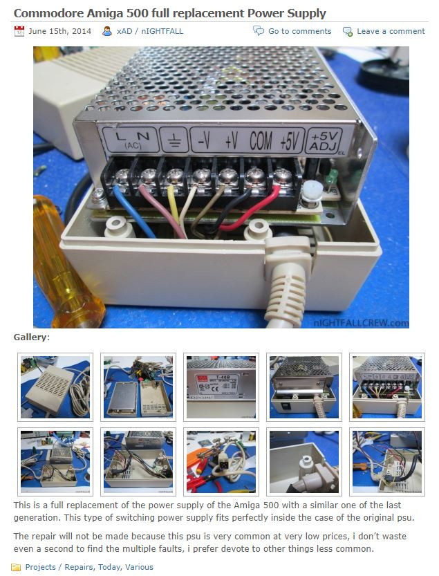 Do tej grupy sprowadzam wszelkiego typu nieoryginalne konstrukcje złożone z gotowych podzespołów. Często taki gotowy zasilacz da się upchać do obudowy po starym niedziałającym zasilaczu do Amigi, co jak dla mnie jest rozwiązaniem idealnym — dostajemy konstrukcję nową, która bezawaryjnie przetrwa kolejne lata, a jednocześnie wciąż jest to upakowane w skorupę retro. Traktuję to jako profesjonalne odświeżenie starego zasilacza.