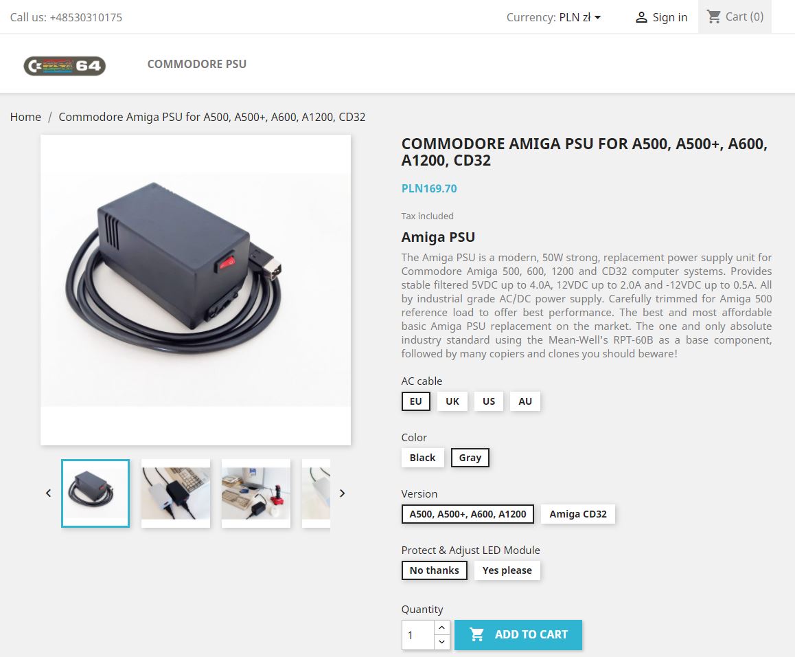 C64PSU (pomimo faktu, że jedyna wersja strony to wersja angielskojęzyczna) zdaje się być polską firmą, wszak w stopce strony znajdziemy adres „C64PSU.COM by Electroware 43-100 Tychy Poland”. Co prawda trafiłem na ich stronę, poszukując zasilacza do Amigi, ale z tego co widzę, oferują oni całą gamę zasilaczy do starych komputerów spod znaku Commodore, a więc zarówno A500, Commodore64 czy też Commodore C128. Świetnie! Dobrze wiedzieć, że są firmy oferujące (co warto zaznaczyć) nowo wyprodukowane zasilacze dedykowane do kilkudziesięcioletnich komputerów osobistych.