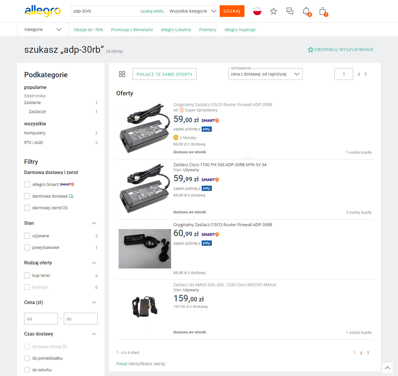 „Oryginalny Zasilacz CISCO Router Firewall ADP-30RB” – tu proponowana cena to 60.99 zł