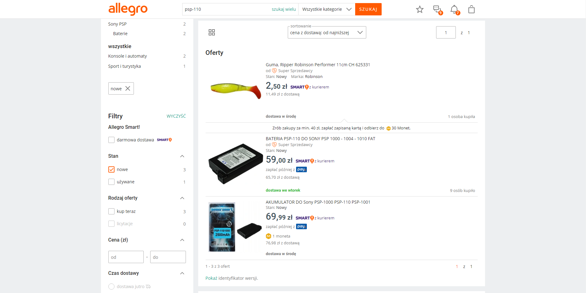Zabrałem się więc za poszukiwanie nowej baterii — pierwszym sprawdzonym przeze mnie miejscem było nasze ojczyste Allegro. Tutaj o dziwo (pomijając gumową rybę) mamy tylko dwie oferty.