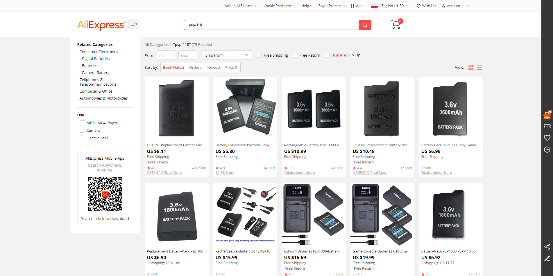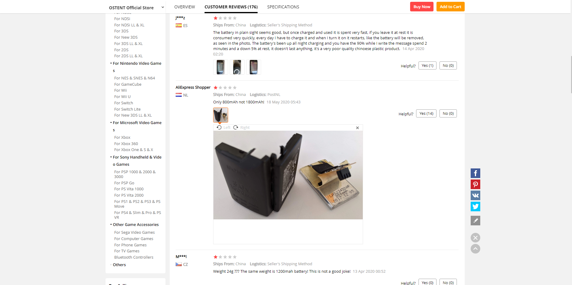 Znacznie lepiej prezentowało się Aliexpress — pod hasłem „PSP-110” znalazłem ponad 73 ofert, jednak po dokładniejszym przeanalizowaniu kilkunastu z nich trafiłem (w morzu lakonicznie chwalących produkt komentarzy) na kilka bardziej technicznych i rozbudowanych komentarzy, które jasno sugerowały, że tym razem komentarz wystawił ktoś, kto faktycznie jest w stanie fachowo ocenić produkt i… Cóż… Nie były to przychylne opinie. Dodatkowo pewien użytkownik postanowił rozebrać jedną z baterii i jej wnętrze było co najmniej zaskakujące — zamiast spodziewanych ogniw o pojemności 1800 mAh w środku znalazł ogniwo 800 mAh z 2017 roku.