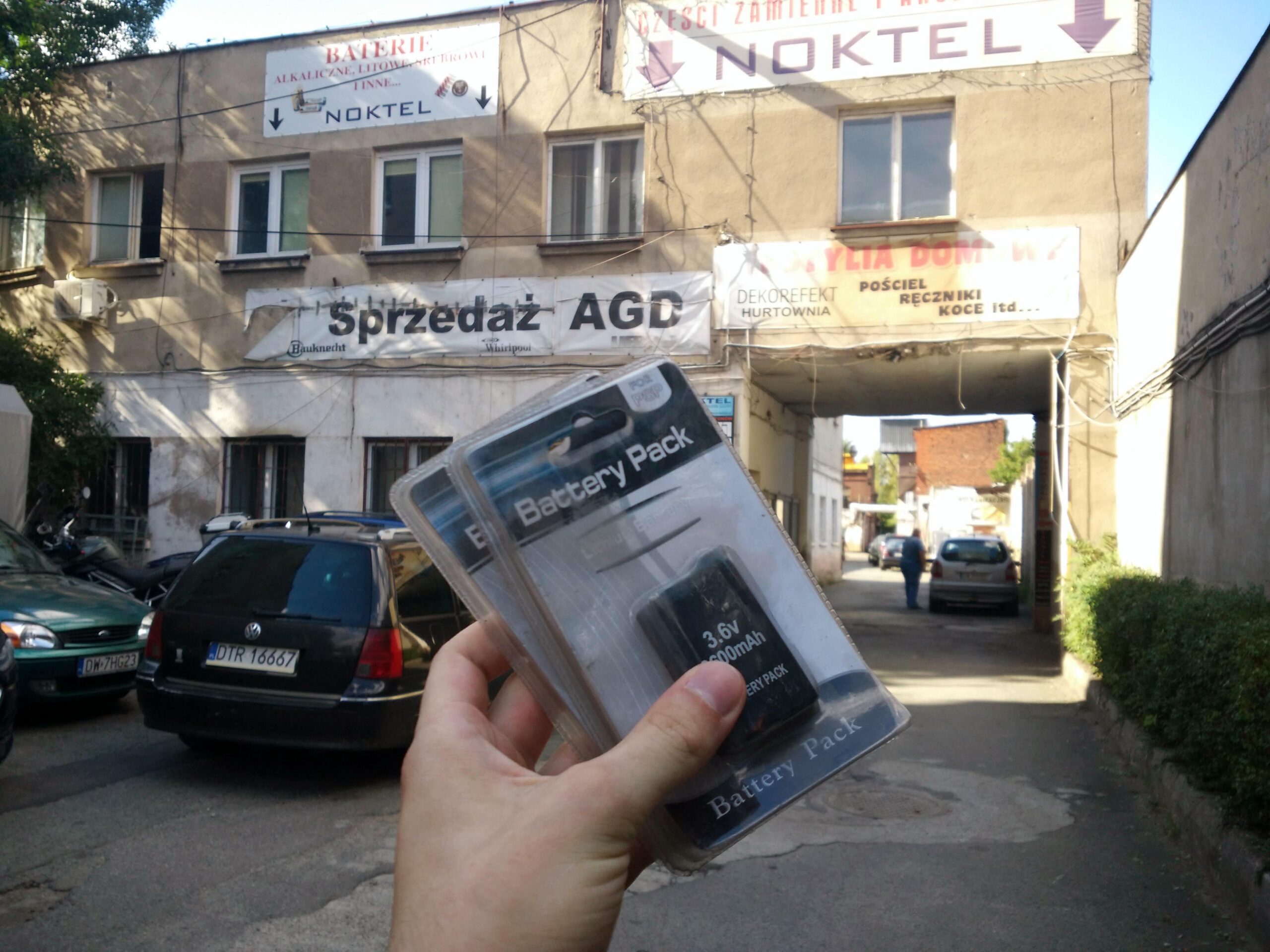 Biorąc pod uwagę nowe fakty, postanowiłem w pierwszej kolejności spróbować poszukać baterii w lokalnych sklepach. Tydzień później będąc we Wrocławiu przechadzając się w okolicy Dworca Świebodzkiego zauważyłem szyld sklepu z akumulatorami, i postanowiłem zapytać o baterię do konsoli — niestety okazało się, że jest to mały sklepik z akumulatorami samochodowymi, ale Pan sprzedawca podpowiedział mi, że ~200m dalej „w bramie” jest hurtownia baterii i być może tam znajdę to czego szukam.