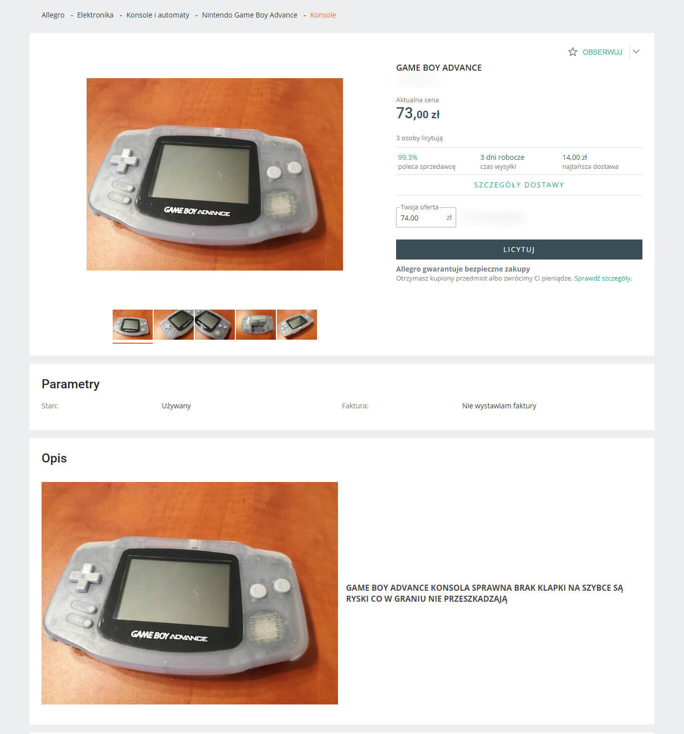 Aukcja konsoli w serwisie aukcyjnym