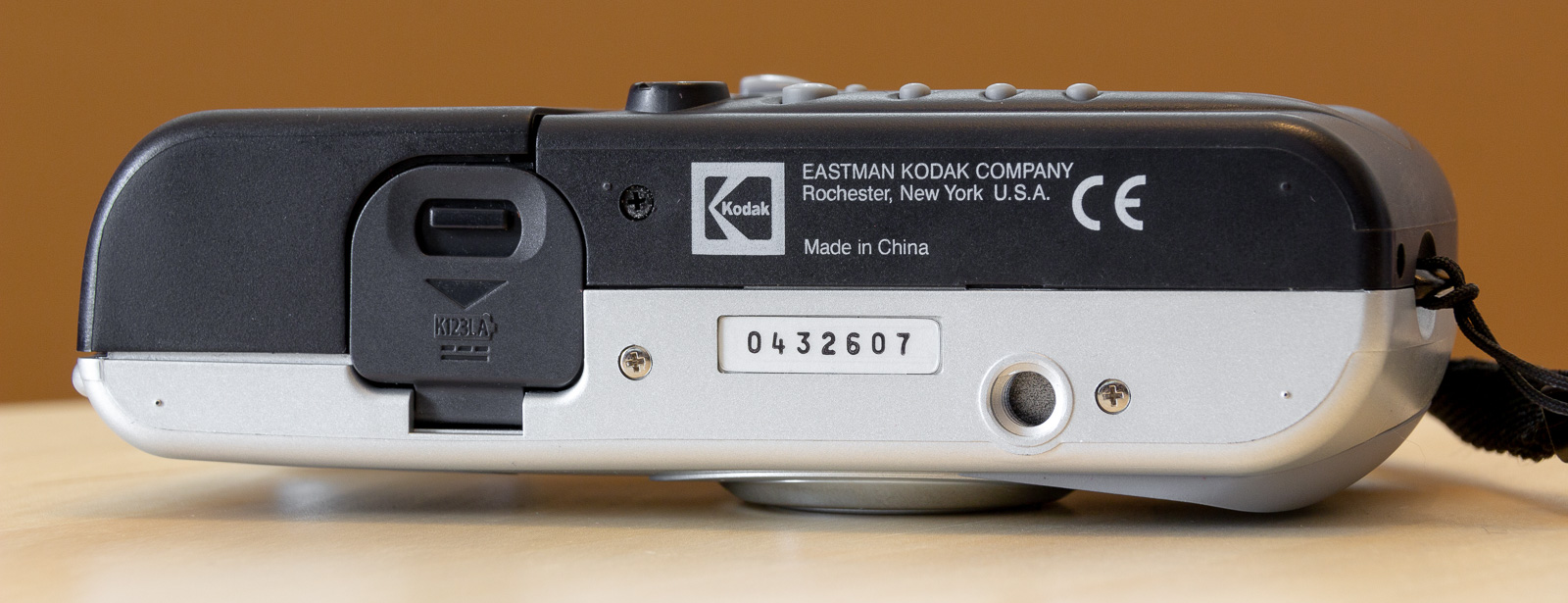 Na dole znajdziemy klapkę, za którą schowana jest bateria zasilająca aparat, logotyp producenta i numer seryjny urządzenia, a także gwint mocowania statywu ¼ cala. Miło ze strony Kodaka, że na klapce baterii umieścili oznaczenie wymaganej baterii – K123LA (to konkretny model produkowany przez firmę Kodak, natomiast ogólna nazwa tej baterii to CR123).